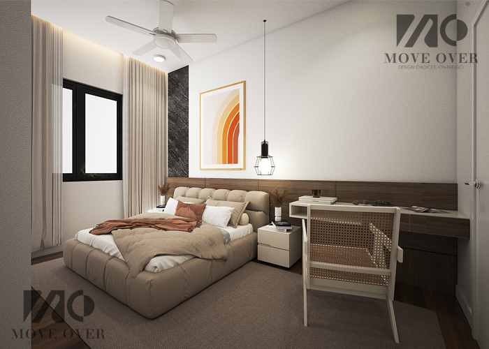 A bright and airy bedroom incorporating natural light and soft textures. The seamless blend of organic elements and modern finishes enhances its tranquil ambiance. A refreshing retreat designed for relaxation and style.